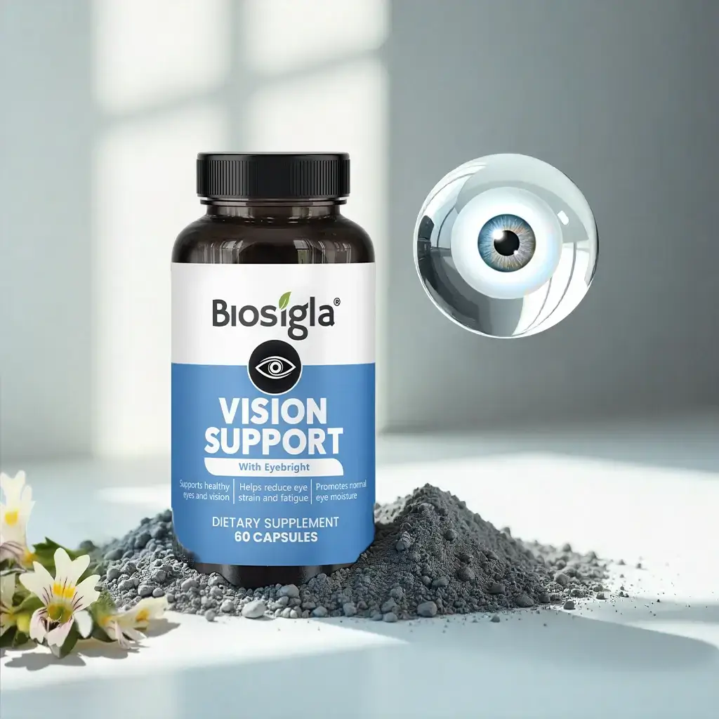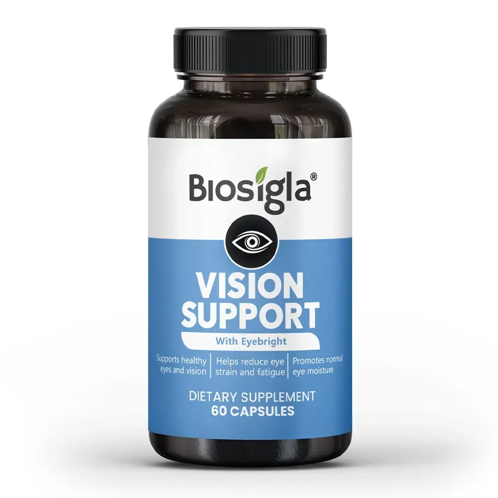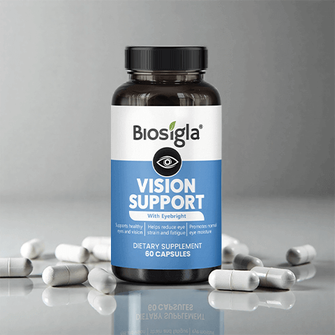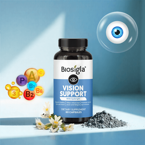 Biosigla Vision Support capsules are quickly absorbed into the bloodstream, where the active ingredients work to support eye health and visual function. Eyebright enhances visual clarity and soothes irritation, while Essential Vitamins act as powerful antioxidants, protecting retinal cells from oxidative damage and blue light. Omega-3 and Zinc provide crucial lubrication to combat dryness and support the structural health of the macula. Together, these ingredients promote sharper focus, reduce eye strain and fatigue, and protect against long-term visual decline, ensuring stronger eye health and better overall visual wellness.