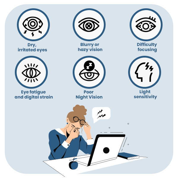 The signs of vision issues can develop over time as eye function declines. Poor eye health may lead to blurred vision, eye strain, difficulty focusing, and headaches. Depending on severity, it may result in dry, irritated eyes, poor night vision, increased sensitivity to light, and frequent eye fatigue.